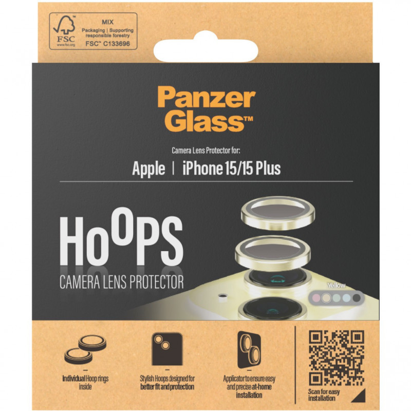 "PanzerGlass ® Hoops® Camera Lens Protector Yellow iPhone 15 | 15 Plus. Brand compatibility: Apple, Compatibility: Apple - iPhone 15, Apple - iPhone 15 Plus. Dry application. Protection features: Scratch resistant, Shock resistant. Privacy filtering function, Material: Tempered glass, Product colour: Yellow. Quantity per pack: 1 pc(s)"\n"No ”Oops!” with Hoops! The PanzerGlass® Hoops Camera Lens Protector keeps your camera lenses safe from accidental drops on stone-hard floors, bumps against sharp corners, and the screeching kiss of keys in your pocket. The slim profile optic rings are equipped with scratch-and shock-resistant glass and a metal frame that protect your lenses as well as looking great. And if you’re worried about image distortion, you can rest easy: Hoops don’t affect the clarity of your lenses or the quality of your photos – they just give you a bit more peace of mind. The optic rings are designed for easy application and perfect fit. They are equipped with a silicone adhesive along the edges and come with an easy-to-use applicator that makes installation so simple that most people can do it on the first try! And remember: Once Hoops are installed, you’ll never again fear the sight of your phone tumbling to the ground camera first. This may not happen, but if it does, you’ll regret not having clicked “add to cart”. Hoops protect and prolong the lifetime of your phone so that one day you can pass it on to someone else who will love it just as much as you do. It’s the new circle of phone life. By extending the lifespan of our devices, we postpone the need to produce new devices. This is one way of working toward a more sustainable future. And to top it all off, Hoops – of course, comes in a recyclable FSC™-certified box."