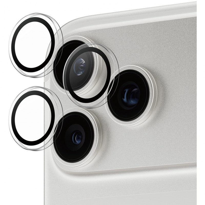"PanzerGlass ® Hoops® Camera Lens Protector Transparent iPhone 17 Pro | iPhone 17 Pro Max | iPhone 16 Pro | 16 Pro Max. Brand compatibility: Apple, Compatibility: Apple - iPhone 17 Pro, Apple - iPhone 17 Pro Max, Apple - iPhone 16 Pro, Apple - iPhone 16 Pro Max. Dry application. Protection features: Scratch resistant, Shock resistant. Material: Tempered glass, Silicone, Product colour: Transparent. Quantity per pack: 1 pc(s)"\n"No ”Oops!” with Hoops! The PanzerGlass® Hoops Camera Lens Protector keeps your camera lenses safe from accidental drops on stone-hard floors, bumps against sharp corners, and the screeching kiss of keys in your pocket. The slim profile optic rings are equipped with scratch-and shock-resistant glass and a metal frame that protect your lenses as well as looking great. And if you’re worried about image distortion, you can rest easy: Hoops don’t affect the clarity of your lenses or the quality of your photos – they just give you a bit more peace of mind. The optic rings are designed for easy application and perfect fit. They are equipped with a silicone adhesive along the edges and come with an easy-to-use applicator that makes installation so simple that most people can do it on the first try! And remember: Once Hoops are installed, you’ll never again fear the sight of your phone tumbling to the ground camera first. This may not happen, but if it does, you’ll regret not having clicked “add to cart”. Hoops protect and prolong the lifetime of your phone so that one day you can pass it on to someone else who will love it just as much as you do. It’s the new circle of phone life. By extending the lifespan of our devices, we postpone the need to produce new devices. This is one way of working toward a more sustainable future. And to top it all off, Hoops – of course, comes in a recyclable FSC™-certified box."