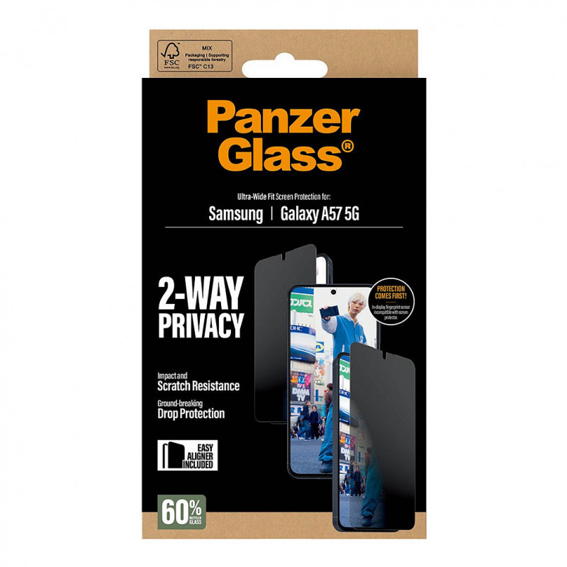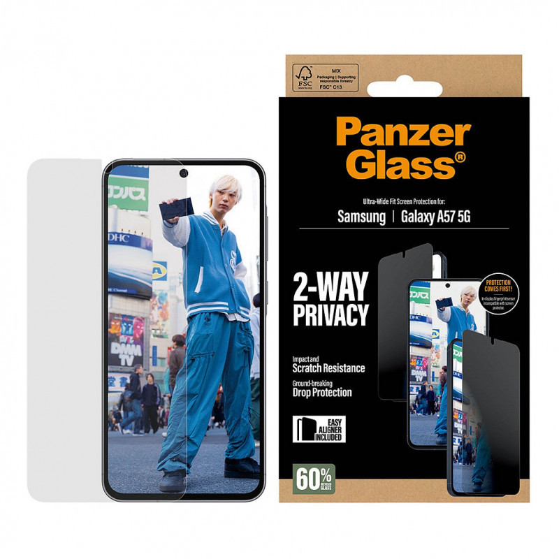 PanzerGlass Privacy Displayschutz – tai grūdinto stiklo privatumo ekrano apsauga, skirta Samsung Galaxy A57 modeliui. Ji sukurta taip, kad apsaugotų ekraną nuo įbrėžimų ir smūgių, tuo pačiu ribodama matomumą iš šonų, kad pašaliniai žmonės negalėtų lengvai matyti jūsų ekrano turinio.