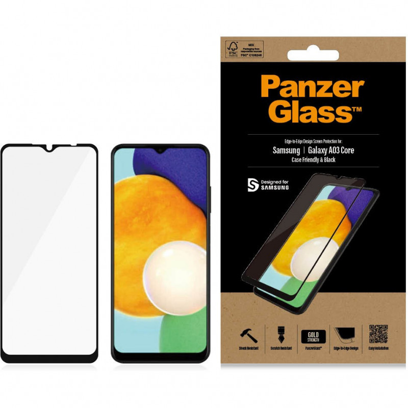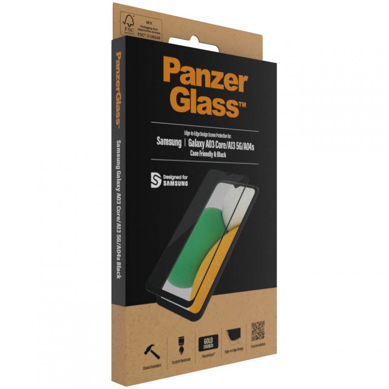 "PanzerGlass ® Screen Protector Samsung Galaxy A03 core | A13 5G | A04s. Brand compatibility: Samsung, Compatibility: Samsung - Galaxy A03 core, Samsung - Galaxy A13 5G, Samsung - Galaxy A04s. Dry application. Protection features: Scratch resistant, Shock resistant. Material: Tempered glass, Polyethylene terephthalate (PET), Silicone, Product colour: Transparent. Quantity per pack: 1 pc(s)"\n"Protect your phone from the hazards of everyday life with PanzerGlass®. Accidental bumps against sharp-edged dangers in your pocket or crushing falls onto stone-hard pavements are no match for this scratch and shock-resistant screen protector. The screen protector is easy to apply and once installed, you’ll never again fear the sight of your phone tumbling to the ground. This may never happen, but if it does, you’ll regret not having clicked “add to cart”.
