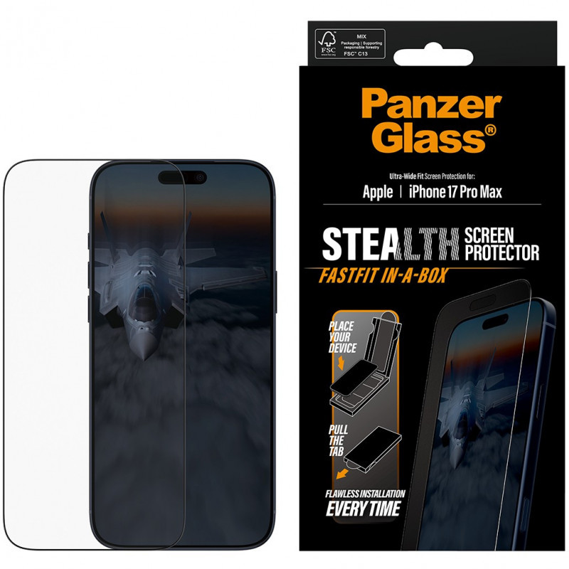 "PanzerGlass ® Stealth Screen Protector iPhone 17 Pro Max | Ultra-Wide Fit w. FASTFIT IN-A-BOX. Brand compatibility: Apple, Compatibility: Apple - iPhone 17 Pro Max. Dry application. Protection features: Scratch resistant, Shock resistant. Material: Tempered glass, Polyethylene terephthalate (PET), Silicone, Product colour: Transparent. Quantity per pack: 1 pc(s)"\n"FLAWLESS INSTALLATION EVERY TIME. Installation has never been easier with the new FASTFIT IN-A-BOX system. Say goodbye to alignment issues and dust intrusion. Simply place your phone face-up, pull the tab, and enjoy a flawless installation every time.