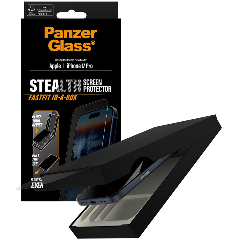"PanzerGlass ® Stealth Screen Protector iPhone 17 Pro | Ultra-Wide Fit w. FASTFIT IN-A-BOX. Brand compatibility: Apple, Compatibility: Apple - iPhone 17 Pro. Dry application. Protection features: Scratch resistant, Shock resistant. Material: Tempered glass, Polyethylene terephthalate (PET), Silicone, Product colour: Transparent. Quantity per pack: 1 pc(s)"\n"FLAWLESS INSTALLATION EVERY TIME. Installation has never been easier with the new FASTFIT IN-A-BOX system. Say goodbye to alignment issues and dust intrusion. Simply place your phone face-up, pull the tab, and enjoy a flawless installation every time.
