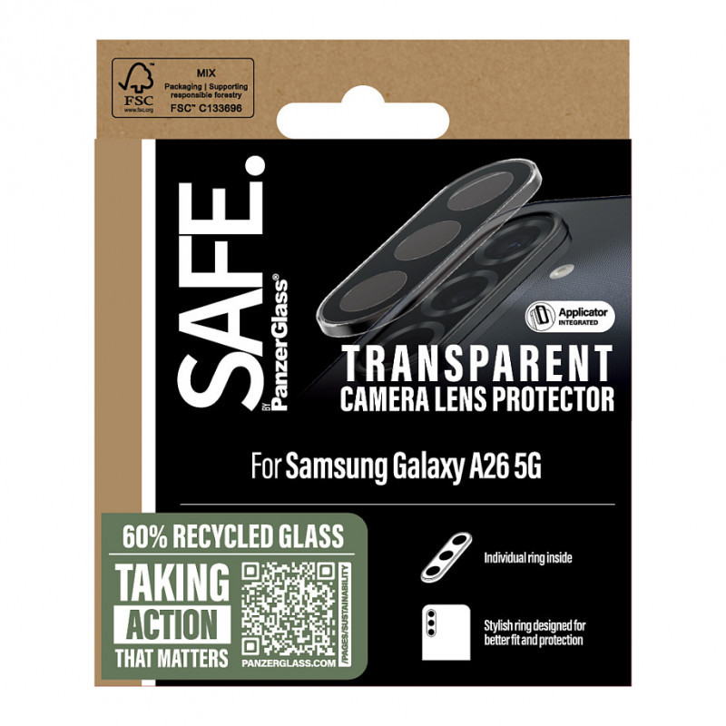 "PanzerGlass SAFE. by ® Camera Lens Protector Transparent Samsung Galaxy A26 5G. Brand compatibility: Samsung, Compatibility: Samsung - Galaxy A26 5G. Dry application. Protection features: Scratch resistant, Shock resistant. Material: Silicone, Tempered glass, Product colour: Transparent. Quantity per pack: 1 pc(s)"\n"It’s your life. It’s your choice. It’s your moment. With this camera lens protector from SAFE. by PanzerGlass® you can capture all the beautiful moments of your life without worrying about dance floor mishaps, selfies gone wrong or posting catastrophes scratching your camera lenses. The slim profile optic rings even look great on your phone! Like a cool design accessory! And if you’re worried about image distortion, rest easy: The camera lens protector doesn’t affect the quality of your photos in ANY way – it just gives you a bit more peace of mind. Can you feel it? Love is in the air. Love for phones and the planet. It’s the new circle of phone life. When you keep your camera lenses SAFE., you prolong the lifetime of your beloved phone so that you can one day pass it on to another phone lover who will love it just as much as you do. Choose SAFE. and give your phone a second, third or fourth life! This is one way of working toward a more sustainable future! Another is to use more sustainable packaging. So, of course, this product comes in a recyclable FSC™-certified box. Everybody deserves to be SAFE. Without hassle, red tape, or unnecessary complexity. This camera lens protector is equipped with a silicone adhesive along the edges and comes with an easy-to-use applicator that makes installation so simple you can do it even if you’re all thumbs! And remember: Once you’re done, you’ll never again fear the sight of your phone tumbling to the ground camera first. This may not happen, but if it does, you’ll regret not having clicked “add to cart”. Keep your phone SAFE."