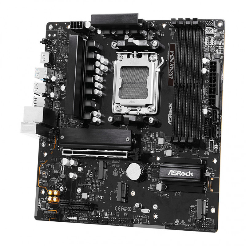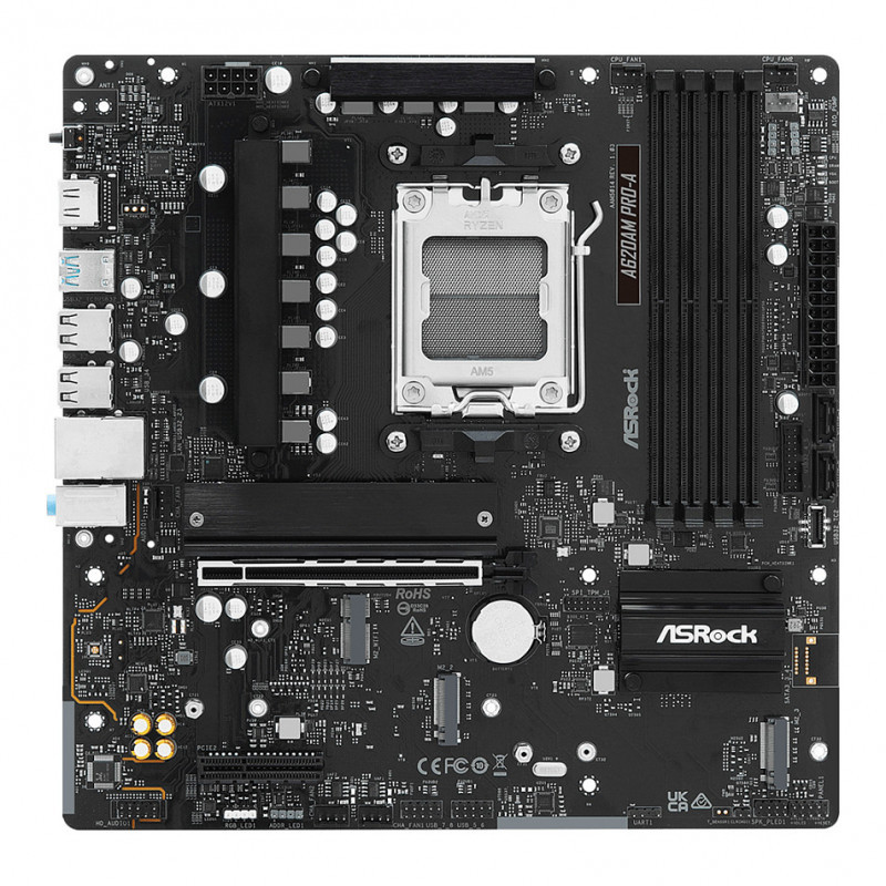 "Asrock A620AM PRO-A. Processor manufacturer: AMD, Processor socket: Socket AM5, Compatible processor series: AMD Ryzen 7000 Series, AMD Ryzen 8000 Series, AMD Ryzen 9000 Series. Supported memory types: DDR5-SDRAM, Maximum internal memory: 256 GB, Memory slots type: DIMM. Supported storage drive interfaces: M.2, NVMe, SATA III, Supported storage drive types: HDD & SSD, RAID levels: 0, 1, 10. Graphics card family: AMD, Graphics card: AMD RDNA 2, Maximum resolution: 3840 x 2160 pixels. Ethernet interface type: 2.5 Gigabit Ethernet, Fast Ethernet, Gigabit Ethernet, LAN controller: Dragon RTL8125BG"\n"Optimized for stability, durability, and efficiency. It combines reliable performance, user-friendly features and streamlined style for daily computing tasks.