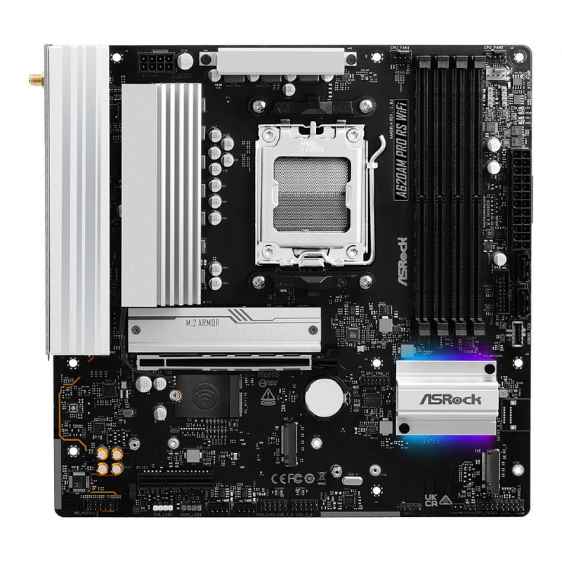 "Asrock A620AM Pro RS WiFi. Processor manufacturer: AMD, Processor socket: Socket AM5, Compatible processor series: AMD Ryzen 7000 Series, AMD Ryzen 8000 Series, AMD Ryzen 9000 Series. Supported memory types: DDR5-SDRAM, Maximum internal memory: 256 GB, Memory slots type: DIMM. Supported storage drive interfaces: M.2, SATA III, RAID levels: 0, 1, 10. Ethernet interface type: 2.5 Gigabit Ethernet, LAN controller: Dragon RTL8125BG, Top Wi-Fi standard: Wi-Fi 6E (802.11ax). Component for: PC, Motherboard form factor: micro ATX, Motherboard chipset family: AMD"\n"Optimized for stability, durability, and efficiency. It combines reliable performance, user-friendly features and streamlined style for daily computing tasks.