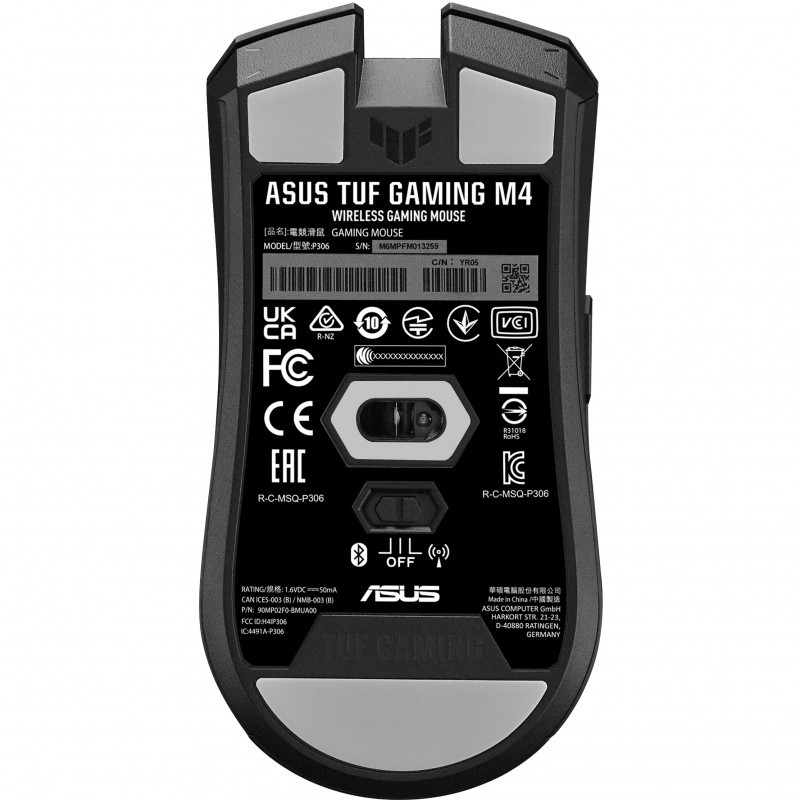 "ASUS TUF Gaming M4 Wireless. Form factor: Right-hand. Movement detection technology: Optical, Device interface: RF Wireless + Bluetooth, Movement resolution: 12000 DPI, Buttons type: Pressed buttons, Buttons quantity: 6, Scroll type: Wheel. Power source: Batteries. Product colour: Black"\n"MAXIMUM
