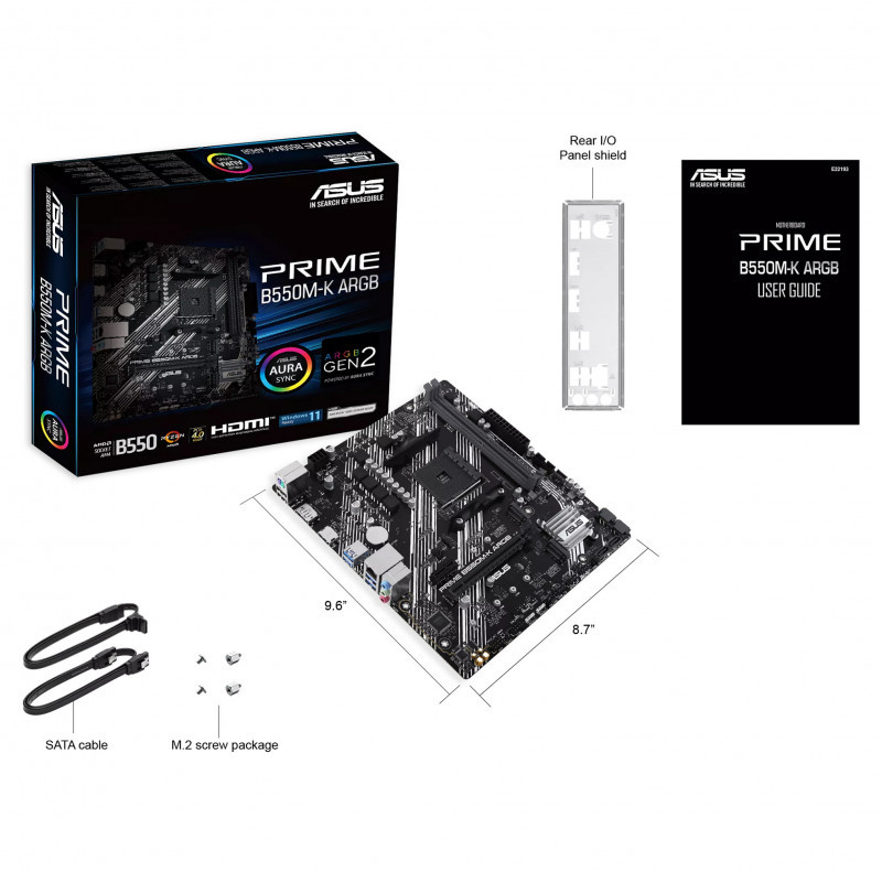 "ASUS PRIME B550M-K ARGB. Processor manufacturer: AMD, Processor socket: Socket AM4. Supported memory types: DDR4-SDRAM, Maximum internal memory: 64 GB, Memory slots type: DIMM. Supported storage drive interfaces: M.2, Supported storage drive types: HDD & SSD, RAID levels: 0, 1, 10. Ethernet interface type: Gigabit Ethernet. Component for: PC, Motherboard form factor: micro ATX, Motherboard chipset family: AMD"\n"ASUS PRIME series is expertly engineered to unleash the full potential of 5000 Series/ 5000 G-Series/ 4000 G-Series/ 3000 Series AMD Ryzen platform. Boasting a robust power design, comprehensive cooling solutions and intelligent tuning options, PRIME B550 series motherboards provide daily users and DIY PC builders a range of performance tuning options via intuitive software and firmware features.