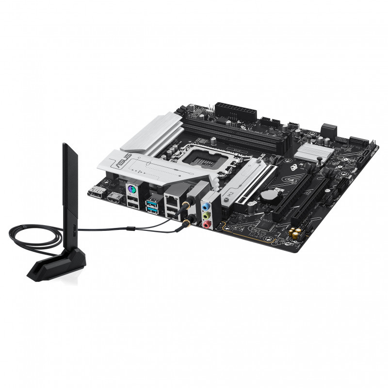 "ASUS PRIME B760M-A WIFI II. Processor manufacturer: Intel, Processor socket: LGA 1700, Compatible processor series: Intel® Celeron®, Intel Core i3 12th Gen, Intel Core i3 13th Gen, Intel Core i3 14th Gen, Intel.... Supported memory types: DDR5-SDRAM, Maximum internal memory: 256 GB, Memory slots type: DIMM. Supported storage drive interfaces: M.2, SATA III, Supported storage drive types: HDD & SSD, RAID levels: 0, 1, 5, 10. Ethernet interface type: 2.5 Gigabit Ethernet, Top Wi-Fi standard: Wi-Fi 6E (802.11ax), Wi-Fi standards: Wi-Fi 6E (802.11ax). Component for: PC, Motherboard form factor: micro ATX, Motherboard chipset family: Intel"\n"PRIME B760M-A WIFI II