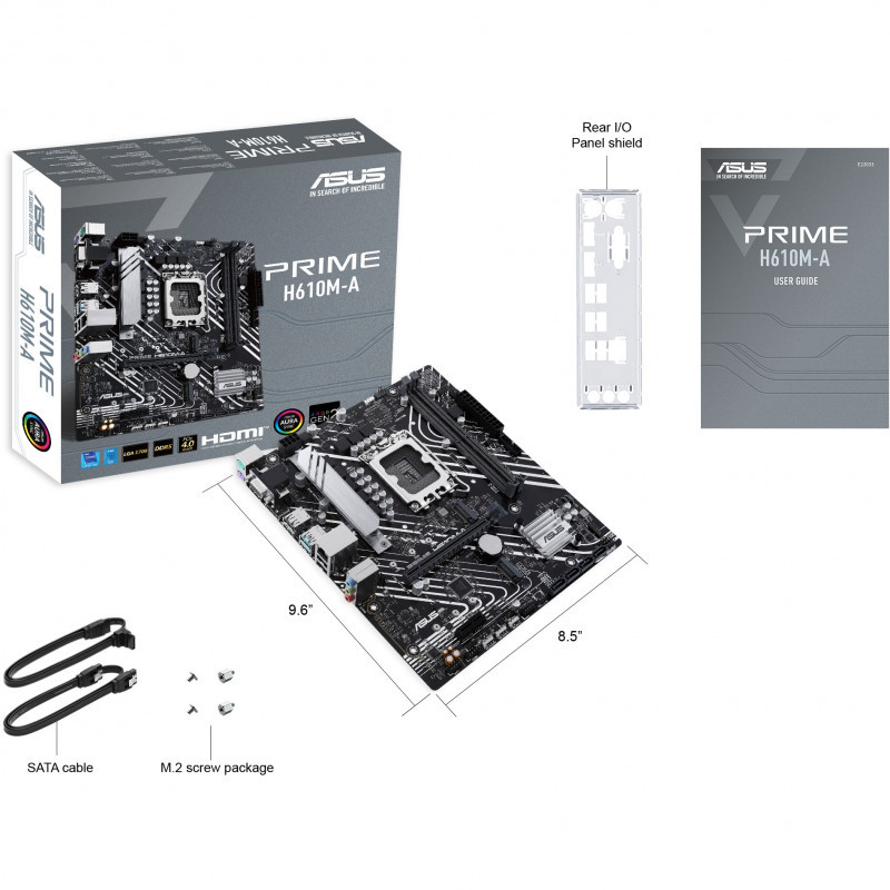"ASUS PRIME H610M-A-CSM. Processor manufacturer: Intel, Processor socket: LGA 1700, Compatible processor series: Intel® Celeron®, Intel® Core™ i3, Intel® Core™ i5, Intel® Core™ i7, Intel® Core™ i9,.... Supported memory types: DDR5-SDRAM, Maximum internal memory: 96 GB, Memory slots type: DIMM. Supported storage drive interfaces: M.2, SATA III, Supported storage drive types: HDD & SSD. Ethernet interface type: Fast Ethernet, Gigabit Ethernet. Component for: PC, Motherboard form factor: micro ATX, Motherboard chipset family: Intel"\n