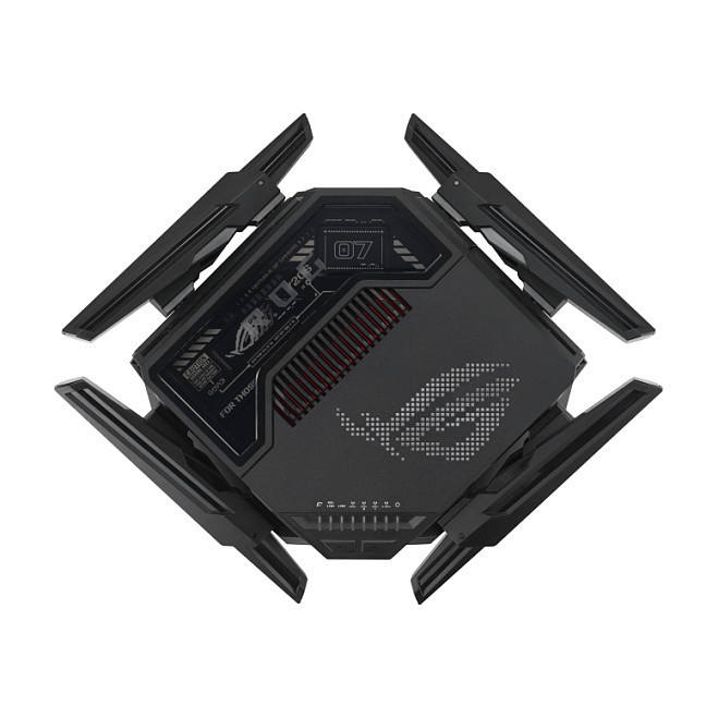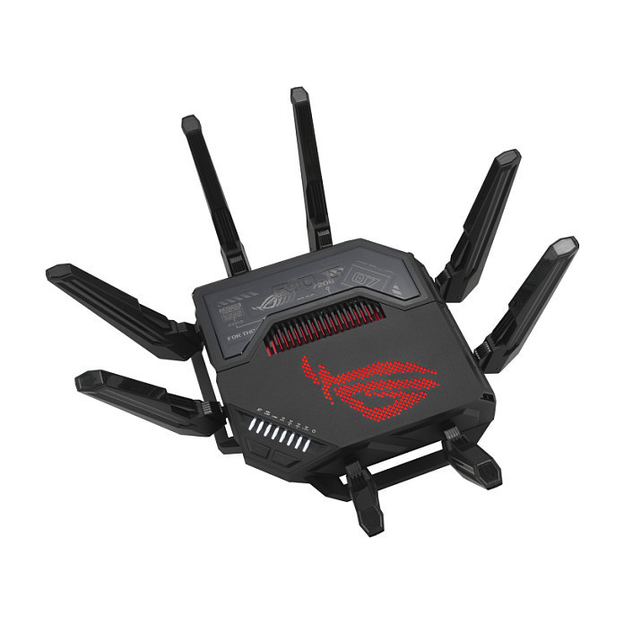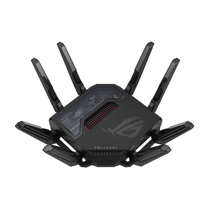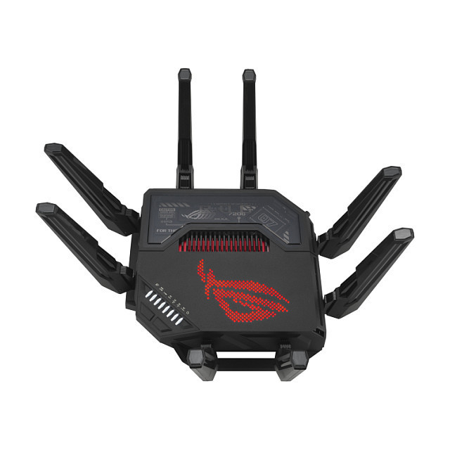 "ASUS ROG Rapture GT-BE98. Wi-Fi band: Quad-band (2.4 GHz / 5 GHz-1 / 5 GHz-2 / 6 GHz), Top Wi-Fi standard: Wi-Fi 7 (802.11be), WLAN data transfer rate (max): 11529 Mbit/s. Ethernet LAN interface type: 10 Gigabit Ethernet, Ethernet LAN data rates: 10,100,1000,2500,10000 Mbit/s, VPN support: VPN Client L2TP VPN Client Open VPN VPN Client PPTP VPN Client WireGuard VPN Server IPSec VPN.... Security algorithms: SSH, WPA-Enterprise, WPA-PSK, WPA2-Enterprise, WPA2-PSK, WPA3-Enterprise, WPA3-PSK, WPS. Product type: Tabletop router, Product colour: Black, LED indicators: LAN, Power, WAN. Cables included: LAN (RJ-45)"\n"ROG Rapture GT-BE98