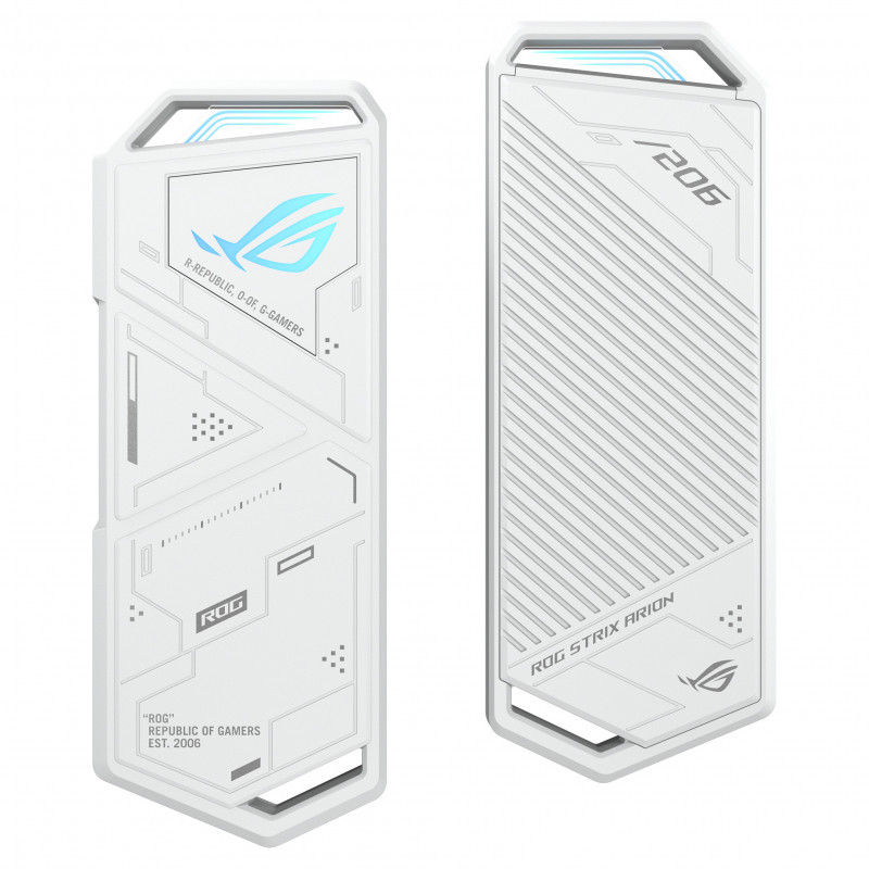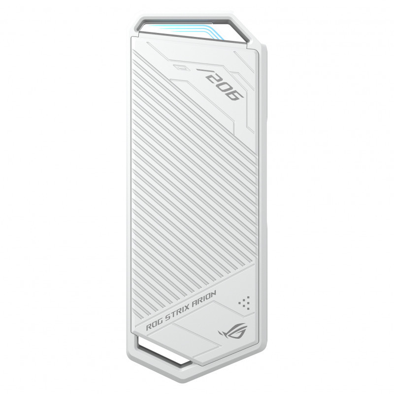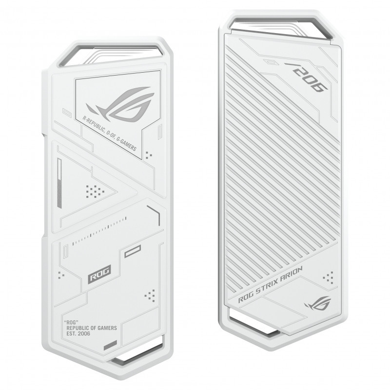 "ASUS ROG Strix Arion White Edition. Product type: SSD enclosure. Number of storage drives supported: 1, Storage drive size: M.2, Supported storage drive interfaces: M.2, PCI Express. Data transfer rate: 10 Gbit/s. Product colour: White. USB connector type: USB Type-C"\n"ROG Strix Arion M.2 NVMe SSD Enclosure—USB3.2 Gen 2x1 Type-C (10 Gbps), Dual USB-C to C and USB-C to A Cables, Screwdriver-Free, Thermal Pads Included, Fits PCIe 2280/2260/2242/2230 M key/B+M Key