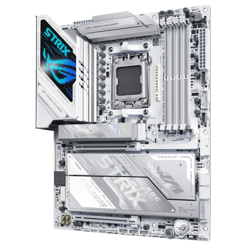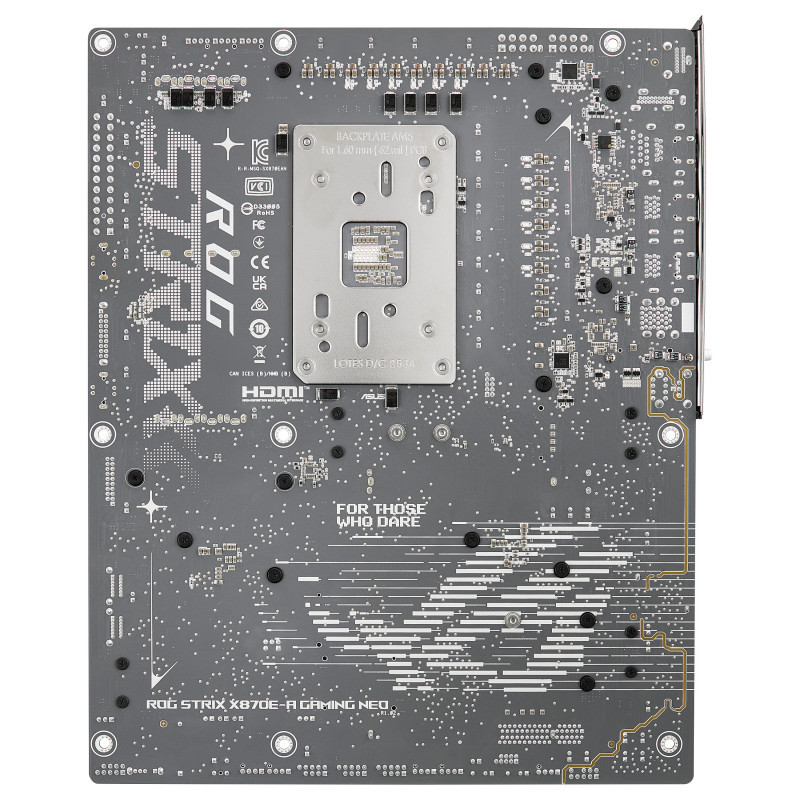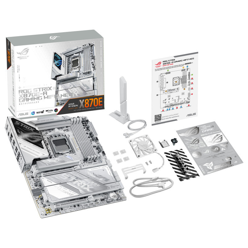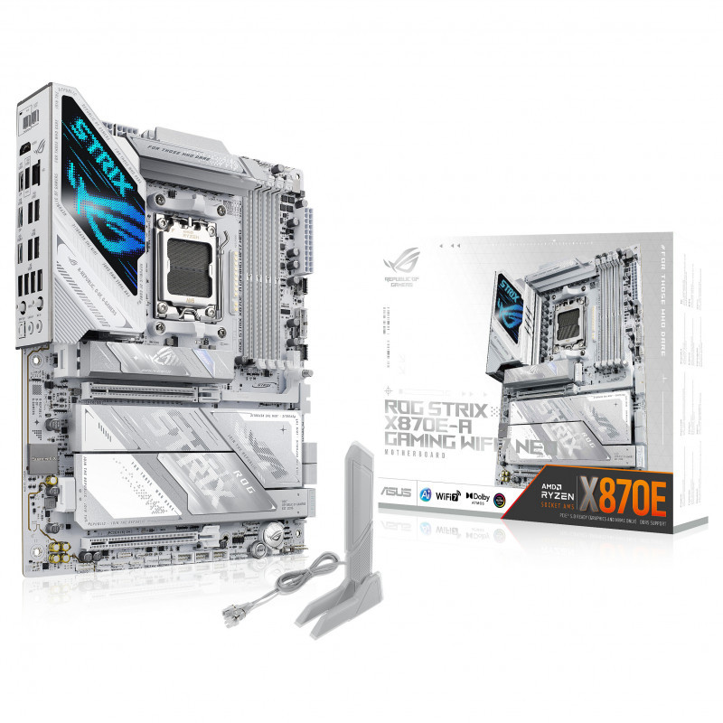 "ASUS ROG STRIX X870E-A GAMING WIFI7 NEO. Processor manufacturer: AMD, Processor socket: Socket AM5, Compatible processor series: AMD Ryzen 9000 Series, AMD Ryzen 8000 Series, AMD Ryzen 7000 Series. Supported memory types: DDR5-SDRAM, Maximum internal memory: 256 GB, Memory slots type: DIMM. Supported storage drive interfaces: SATA III, M.2, Supported storage drive types: HDD & SSD, RAID levels: 0, 1, 5, 10. Ethernet interface type: 5 Gigabit Ethernet, Top Wi-Fi standard: Wi-Fi 7 (802.11be), Wi-Fi standards: Wi-Fi 7 (802.11be). Component for: PC, Motherboard form factor: ATX, Motherboard chipset family: AMD"\n"ROG STRIX X870E-A gaming wifi7 Neo