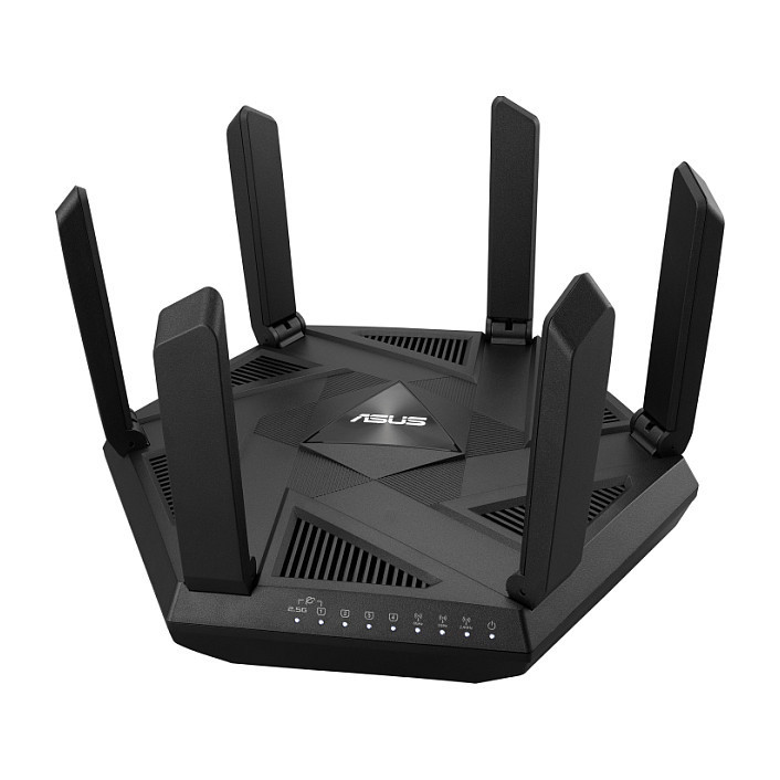 "ASUS RT-AXE7800. WAN connection type: RJ-45. Wi-Fi band: Tri-band (2.4 GHz / 5 GHz / 6 GHz), Top Wi-Fi standard: Wi-Fi 6E (802.11ax), WLAN data transfer rate (max): 4804 Mbit/s. Ethernet LAN data rates: 10,100,1000 Mbit/s, Cabling technology: 10/100/1000Base-T(X), VPN server: IPSec, OVPN, PPTP. Security algorithms: SSH, WPA, WPA-Enterprise, WPA2, WPA2-Enterprise, WPA3, WPS, NAT functionality: PPTP, L2TP, IPSec, RTSP, H.323, SIP Passthrough, PPPoE relay. Product type: Tabletop router, Product colour: Black, LED indicators: LAN, Power, WAN"\n"Low Latency & Less Interference