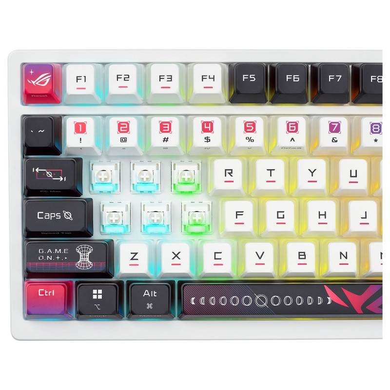 "ASUS ROG Azoth X. Keyboard form factor: 75%, Connectivity technology: Wired & Wireless, Device interface: USB + RF Wireless + Bluetooth, Keyboard key switch: Mechanical. Backlight type: RGB LED, Wrist rest. Cable length: 2 m. Recommended usage: Gaming. Product colour: Black, White"\n"ROG Azoth X 75% custom gaming keyboard with hot-swappable ROG NX V2 Mechanical Switches, dye-sublimated and semi-translucent keycaps, metal top cover, gasket mount, five-layer dampening foam, FR4 positioning plate, south-facing PCB, tri-mode connection with 2.4 GHz SpeedNova technology, OLED display, three-way control knob, wrist rest, three tilt angles, and Mac support