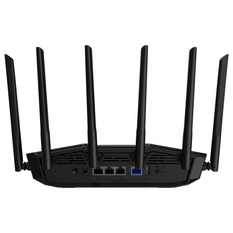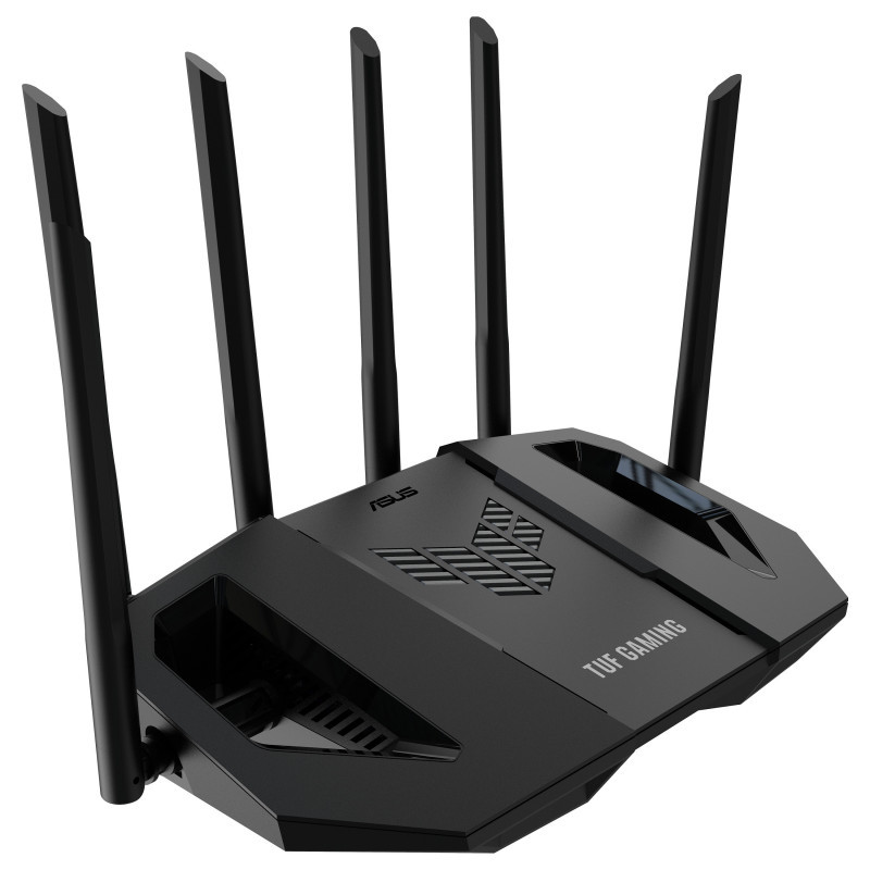 "ASUS TUF Gaming BE6500 (TUF-BE6500). WAN connection type: RJ-45. Wi-Fi band: Dual-band (2.4 GHz / 5 GHz), Top Wi-Fi standard: Wi-Fi 7 (802.11be), WLAN data transfer rate (max): 6500 Mbit/s. Ethernet LAN interface type: 2.5 Gigabit Ethernet, VPN support: Instant Guard VPN Client L2TP VPN Client Open VPN VPN Client PPTP VPN Client WireGuard VPN Server.... Security algorithms: WPA-Enterprise, WPA-PSK2, WPA2-Enterprise, WPA2-Personal, WPA3-Enterprise, WPA3-Personal, WPS, Firewall security: Maximum Firewall Keyword Filter : 64 • Maximum Firewall Network Service Filter : 32 • Maximum.... Product type: Tabletop router, Product colour: Black, LED indicators: LAN, Power, WAN"\n"Inspired by the unique design and power wings of drones, the TUF Gaming BE6500 combines a sleek appearance with advanced cooling efficiency. Its hollow design on both sides enhances heat dissipation for stable all-day operation, enhancing your internet and gaming experience.