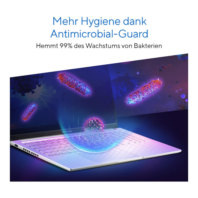 ASUS Antimicrobial Guard Plus is applied to frequently touched areas of your laptop to help keep it hygienic. This technology uses a denser treatment* that inhibits viruses and bacteria. And it is scientifically shown — using the ISO 2170214 and 2219615 standards — to inhibit virus and bacteria growth by more than 99% over a 24-hour period16. Strains used for the tests include the SARS-CoV-2 (COVID-19), H3N2 (Influenza A) and the E. coli bacterium7.
