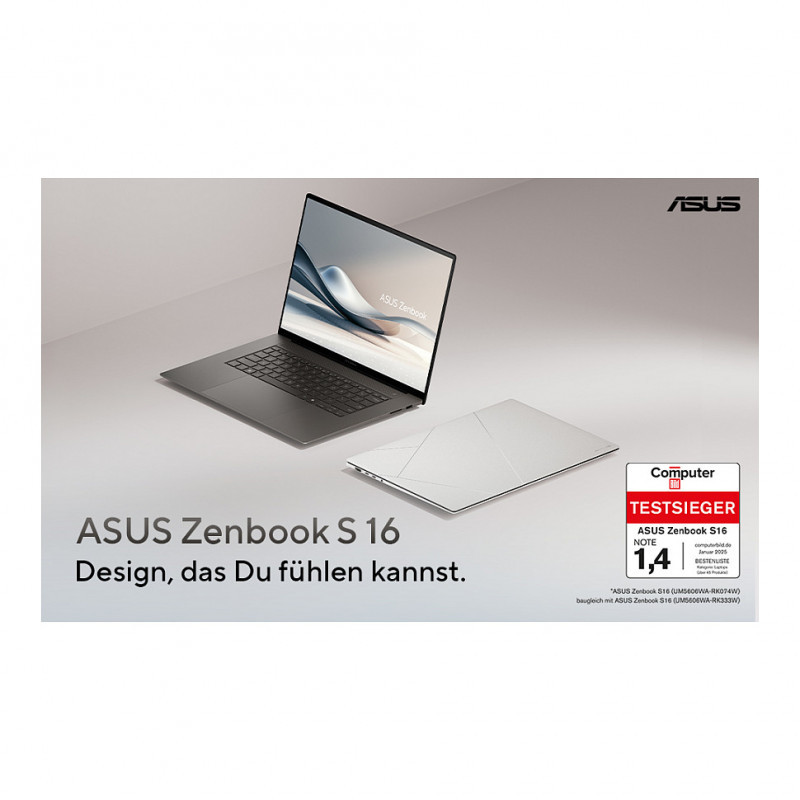 "ASUS Zenbook S 16 UM5606WA-RK333W Copilot+ PC. Product type: Laptop, Form factor: Clamshell. Processor family: AMD Ryzen AI 9 HX, Processor model: 370, Processor frequency: 2 GHz. Display diagonal: 40.6 cm (16""), HD type: WQXGA+, Display resolution: 2880 x 1800 pixels. Internal memory: 32 GB, Internal memory type: LPDDR5x-SDRAM. Total storage capacity: 1 TB, Storage media: SSD. On-board graphics card model: AMD Radeon 890M. Operating system installed: Windows 11 Home. Product colour: Grey"\n"New Zen with superior AI