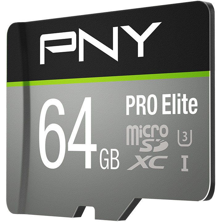 "PNY PRO Elite. Capacity: 64 GB, Flash card type: MicroSDXC, Flash memory class: Class 10, Internal memory type: UHS-I, UHS Speed Class: Class 3 (U3). Product colour: Black, Grey"\n"PNY PRO Elite microSD Cards are the peak of performance for smartphones, tablets, action cameras, drones, DSLRs, video cameras and more.