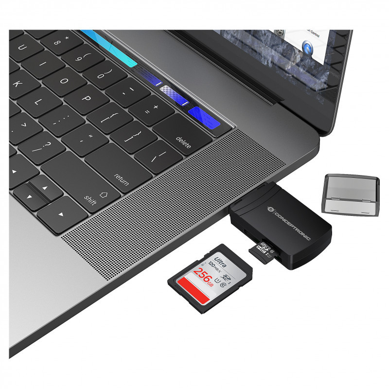 "Conceptronic BIAN06B SD TF/MicroSD 4.0 Card Reader, UHS-II, USB 3.0, 5Gbps. Compatible memory cards: MicroSD (TransFlash), MicroSDHC, MicroSDXC, SD, SDHC, SDXC, Product colour: Black, Data transfer rate: 5000 Mbit/s. Interface: USB 3.2 Gen 1 (3.1 Gen 1) Type-A. Width: 26.5 mm, Depth: 10.5 mm, Height: 57.5 mm. Package width: 75 mm, Package depth: 25 mm, Package height: 95 mm. Windows operating systems supported: Windows 11 Enterprise x64, Windows 10, Windows 11 Home, Windows 10 Education, Windows 11 Pro,..., Mac operating systems supported: Mac OS X 10.14 Mojave, Mac OS X 10.7 Lion, Mac OS X 10.15 Catalina, Mac OS X 10.7.5 Lion, Mac OS X..., Mobile operating systems supported: Android 7.1.2, Android 8.0, Android 8.1, Android 10.0, Android 9.0, Android 11.0, Android 12.0,..."\n"The SD/TF 4.0 Card Reader ensures steady and efficient data transmission, supporting SD/TF 4.0 and UHS-II with USB 3.0 transfer speeds up to 5Gbps. It also allows simultaneous reading and writing of two cards. As a USB-powered device, no external power is needed, making it an ideal companion for travel or everyday use."