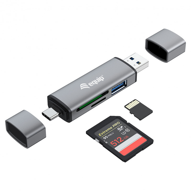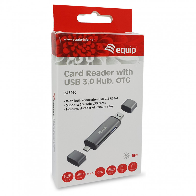 "Equip Card Reader with USB 3.0 Hub, OTG. Compatible memory cards: MicroSD (TransFlash), MicroSDHC, SD, SDHC, Product colour: Grey, Certification: CE & RoHS. Interface: USB 3.2 Gen 1 (3.1 Gen 1) Type-A/Type-C. Width: 202 mm, Depth: 12 mm, Height: 86.2 mm. Quantity per pack: 1 pc(s), Package width: 74 mm, Package depth: 21 mm. Windows operating systems supported: Windows 10, Windows 7, Windows 8, Mac operating systems supported: Mac OS X 10.10 Yosemite, Mac OS X 10.11 El Capitan, Mac OS X 10.12 Sierra, Mac OS X 10.13 High..., Mobile operating systems supported: Android, iOS"\n"The equip 245460 Card Reader with an integrated USB hub (OTG) can either be connected to your smartphone, tablet or notebook. This allows you to access inserted storage media such as USB sticks, SD or MicroSD memory cards. You can connect the device via the hub’s USB A (USB 3.0) or the USB-C™ plug.