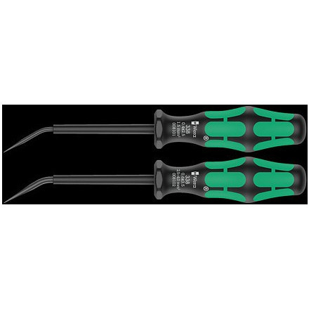 "Wera 05008100001. Quantity per pack: 2 pc(s), Product colour: Black, Green"\n"Set with 2 actuation tools for spring terminals. The curved blades also make it easy to operate spring terminals in distribution boxes which cannot be reached with a straight blade. The blade stays in the terminal block, leaving both hands free to insert the wire. Multi-component Kraftform handle for fast and smooth work."