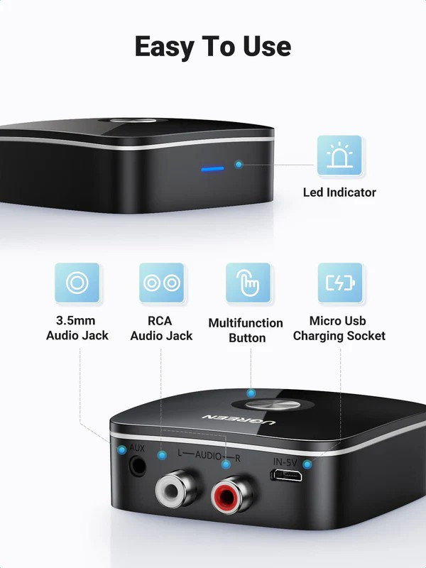 UGREEN CM123 Bluetooth adapter imtuvas (juodas) – 2×RCA/AUX Bluetooth 5.0 (30445) – tai kompaktiškas ir universalus belaidis Bluetooth garso imtuvas, skirtas prijungti tradicines garso sistemas, kolonėles ar ausines prie išmaniųjų telefonų, planšečių ar kitų įrenginių be laidų. Jis leidžia lengvai ir greitai perduoti muziką iš telefono ar planšetės į analoginius garso įrenginius per 3.5 mm AUX ir 2×RCA išvestis, suteikiant patogią belaidžio garso transliaciją be brangių atnaujinimų ar papildomos įrangos.