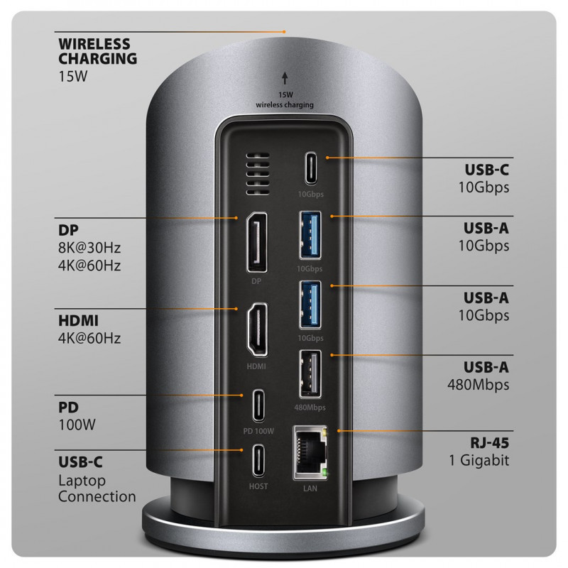 Axagon HMC-WL9 knyginių kompiuterių dokas / jungčių replikatorius Vielinis USB 3.2 Gen 2 (3.1 Gen 2) Type-C Pilka