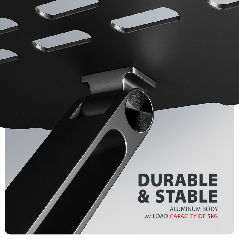 Stovas tinka 10–17,3 colių (25,4–44 cm) įrenginiams ir palaiko iki 5 kg svorio. Aukščio ir kampo reguliavimas užtikrina ergonomišką žiūrėjimo poziciją, o tvirta metalinė konstrukcija garantuoja stabilumą net naudojant sunkesnius nešiojamus kompiuterius ar planšetes. Kompaktiškas dizainas neužima daug vietos ant stalo, todėl idealiai tinka biurams ir namų darbo vietoms.