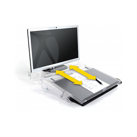 Easily pull the anti-reflecting satin surface towards you and take notes on it. The smooth-running rails allow the platform to slide forward. The high-quality acrylic material makes the FlexDesk 640 stable, and the transparent design ensures that your desk does not look overloaded. The FlexDesk 640 provides great features like three levels of height adjustment between 110 and 180 mm, anti-slip-feet, foam edge for the outer edge of the hand, high sliding edge for heavy file folders, a load capacity up to five kg, and a hidden pen-tray. Start working in a line with the FlexDesk 640 document holder and increase your working comfort and productivity."