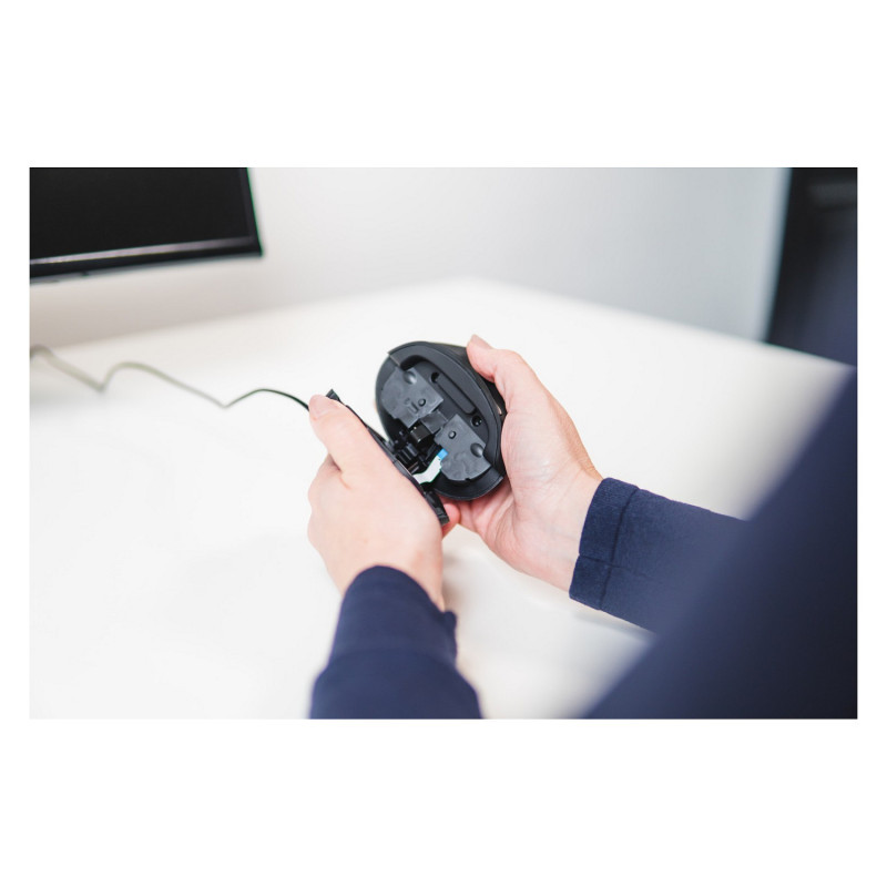 The Oyster Mouse is a vertical mouse that can be used by people who are already used to a vertical mouse grip, but also for people who never used a vertical mouse before. If you never worked with a vertical mouse before, you can start with a low angle and get used to a vertical grip. After a short time you can improve your hand and wrist posture gradually to a larger vertical angle. Your hand and wrist adapt more and more a neutral, vertical position, and this leads to an ergonomic way of working and physical discomfort can be prevented. If you are used to a vertical mouse grip, you can directly set this mouse on a larger inclination angle. The extra wide lip at the bottom edge prevents in your little finger from rubbing on the surface, which provides even more comfort during your mouse work.