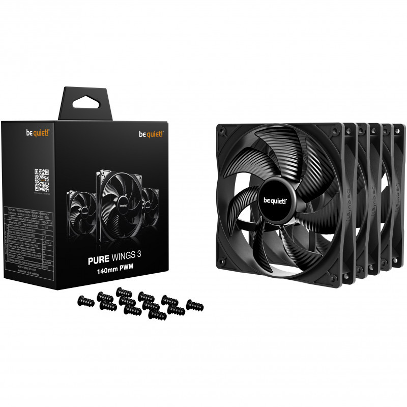 "be quiet! Pure Wings 3 140 mm PWM Triple Pack. Type: Fan, Fan diameter: 14 cm, Rotational speed (max): 1200 RPM, Airflow: 97.5 m³/h, Maximum air pressure: 0.96 mmH2O, Bearing type: Rifle bearing. Voltage: 5 - 13.2 V. Product colour: Black"\n"PURE WINGS 3