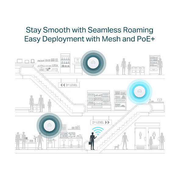 "TP-Link Omada AX3000 Ceiling Mount WiFi 6 Access Point (5-pack). 2.4 GHz, 5 GHz, Maximum data transfer rate: 2976 Mbit/s. Security algorithms: HTTPS, SNMP, SNMPv2, SNMPv3, SSH, WPA, WPA2, WPA3. Ethernet LAN data rates: 10,100,1000 Mbit/s. Power over Ethernet (PoE). Product colour: White"\n"Power up Your Business with New-Era Business WiFi 6