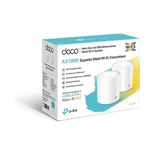 "TP-Link AX1800 Whole Home Mesh Wi-Fi 6 System, 2-Pack. Product colour: White, Antenna type: Internal, Product type: Mesh system. Wi-Fi band: Dual-band (2.4 GHz / 5 GHz), Top Wi-Fi standard: Wi-Fi 5 (802.11ac), WLAN data transfer rate (max): 1775 Mbit/s. Firewall security: SPI. AC input voltage: 100-240 V, AC adapter input current: 0.4 A, AC input frequency: 50-60 Hz. Compliance certificates: CE, RoHS, Certification: FCC, IC, NCC, BSMI, IDA, RCM, JPA, JRF, VCCI, KC"\n"Meet the Next-Gen Mesh Wi-Fi