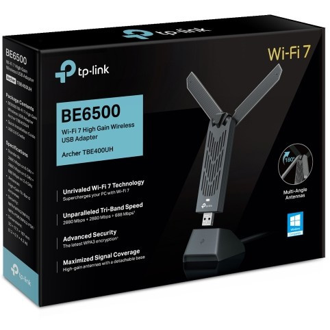 "TP-Link Archer TBE400UH. Connectivity technology: Wired & Wireless, Host interface: USB, Interface: WLAN. Maximum data transfer rate: 2882 Mbit/s, Top Wi-Fi standard: Wi-Fi 7 (802.11be), Wi-Fi band: Tri-band (2.4 GHz / 5 GHz / 6 GHz). Product colour: Grey"\n"WiFi 7, WiFi Like Never Before