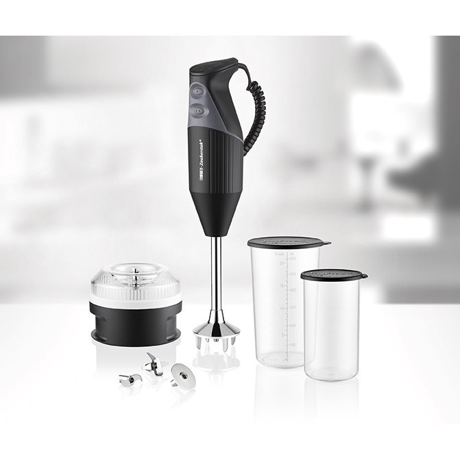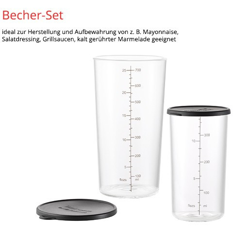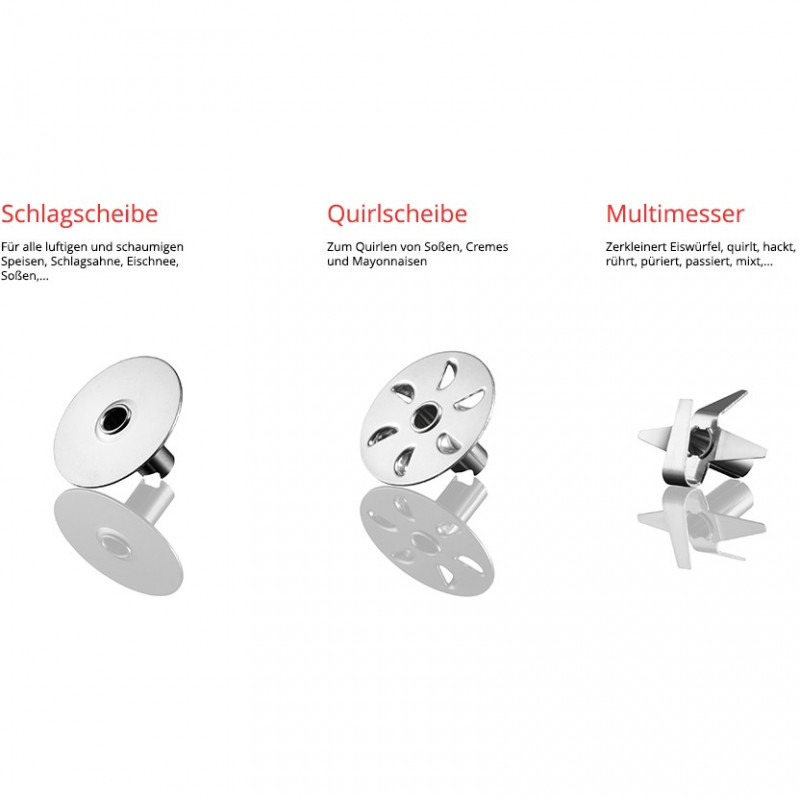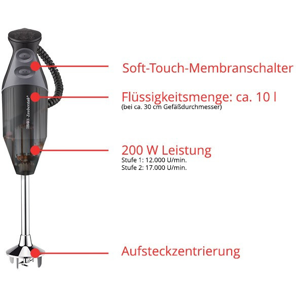 "ESGE M 200 BBQ. Type: Immersion blender, Product colour: Black, Chrome, Cord length: 1.5 m. Bowl capacity: 10 L, Rotational speed (min): 12000 RPM, Rotational speed (max): 17000 RPM. Housing material: Metal, Plastic. Power: 200 W, Power source: AC, AC input voltage: 220 - 240 V. Width: 67 mm, Depth: 97 mm, Height: 346 mm"\n"At either 12,000 rpm or 17,000 rpm, the ESGE-Zauberstab® M 200 BBQ chops, minces, purees or whisks the ingredients for marinades, dips and dressings. This is ensured by its robust, long-lasting AC motor ""Made in Switzerland"" and the safety twin switch. The extensive accessories include not only a multi-blade, beating disc and meat knife, but also a cup set and the exclusive recipe booklet. There is also the practical processor. It chops or grinds spices or nuts - and if smaller quantities are required, its powder disc comes into use."