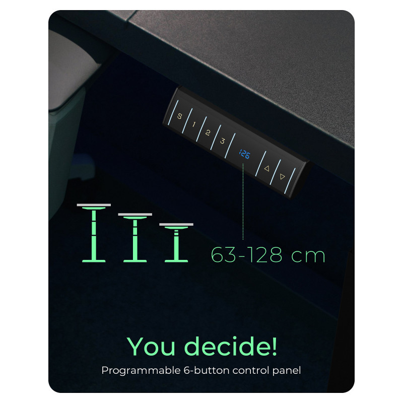The height of the desk can be easily adjusted at the touch of a button, making it perfect for people of different heights. Three memory buttons are available for memorising different heights. Use the convenience either for your favourite scenarios or for co-users of the workstation.