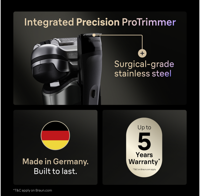 Precision ProTrimmer; Adjusts power to beard density; Ultra thin precision blade; 40° head adaption; Performance assistant display |