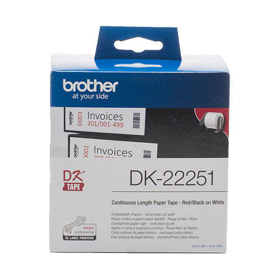 "Brother DK-22251. Label colour: Black and red on white, Tape type: DK, Product colour: Black, Blue, White. Tape width: 6.2 cm, Tape length: 15.24 m, Width: 88 mm. Pallet gross height: 15.6 cm, Master (outer) cases per pallet: 36 pc(s), Layers per pallet: 9 pc(s)"\n"Create custom-sized paper labels with both black and red print to suit any purpose with this genuine Brother Black and Red on White Paper Label Roll. This versatile continuous roll – which allows you to quickly and easily create high quality, legible paper labels – makes organising your paperwork effortless."