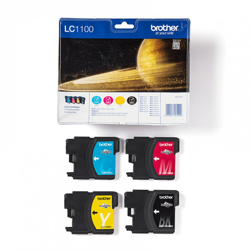 "Brother LC1100VALBP. Supply type: Multi pack, Colour ink page yield: 325 pages, Printing colours: Black, Cyan, Magenta, Yellow, Quantity per pack: 4 pc(s), Black ink page yield: 450 pages"\n"Purchase this value LC1100VALBP Multipack to save on genuine Brother cartridges. Containing the high yield LC1100BK, LC1100C, LC1100M and LC1100Y cartridges, it enables you to conveniently replace all of your ink for less so that your printer continues to deliver the best possible results."