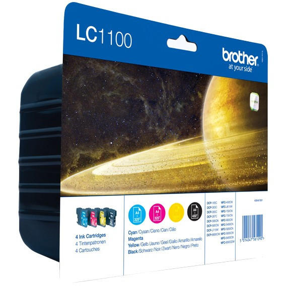"Brother LC1100VALBPDR. Supply type: Multi pack, Colour ink page yield: 325 pages, Printing colours: Black, Cyan, Magenta, Yellow, Quantity per pack: 4 pc(s), Black ink page yield: 450 pages"\n"Purchase this value LC1100VALBP Multipack to save on genuine Brother cartridges. Containing the high yield LC1100BK, LC1100C, LC1100M and LC1100Y cartridges, it enables you to conveniently replace all of your ink for less so that your printer continues to deliver the best possible results."