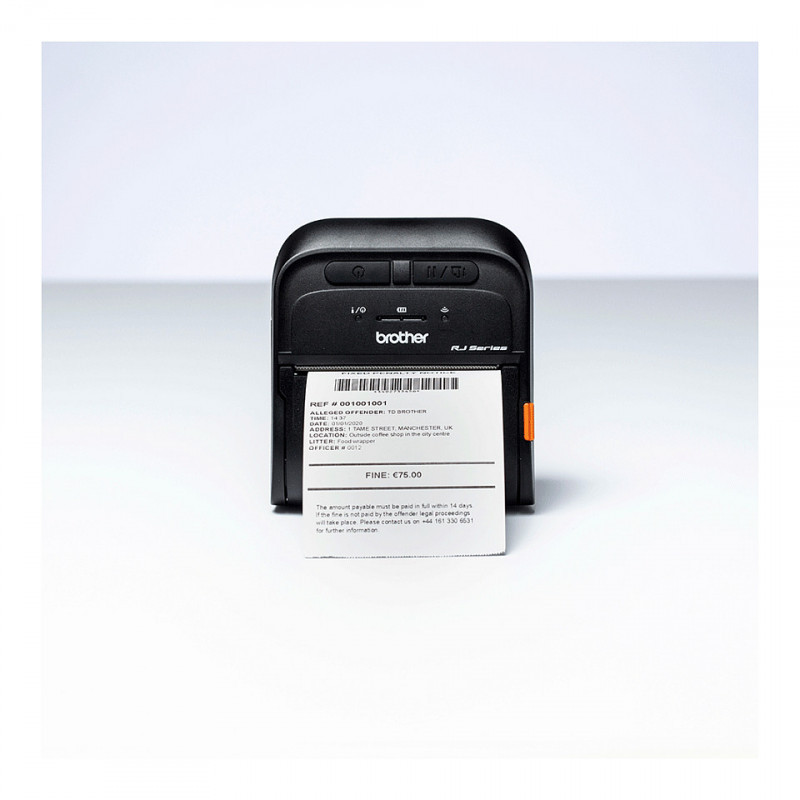 "Brother RJ-3035B. Print technology: Direct thermal, Type: Mobile printer, Maximum resolution: 203 x 203 DPI. Maximum roll diameter: 4 cm, Supported paper width: 80 mm, Maximum printing width: 7.2 cm. Connectivity technology: Wired & Wireless, USB connector: Micro-USB B, Bluetooth profiles: SSP. Built-in barcodes: AZTECCODE, Code 128 (A/B/C), Code 39, Data Matrix, EAN13, EAN8, GS1 DataBar, GS1 DataBar Expanded,..., Internal memory: 32 MB, Flash memory: 16 MB. Product colour: Black"\n"The RJ-3035B mobile printer is ideal for printing receipts and tickets. Lightweight and compact, the 3"" receipt printer has a range of connectivity options and integrates easily into your existing systems thanks to the supported printer command languages and free of charge Software Development Kits."