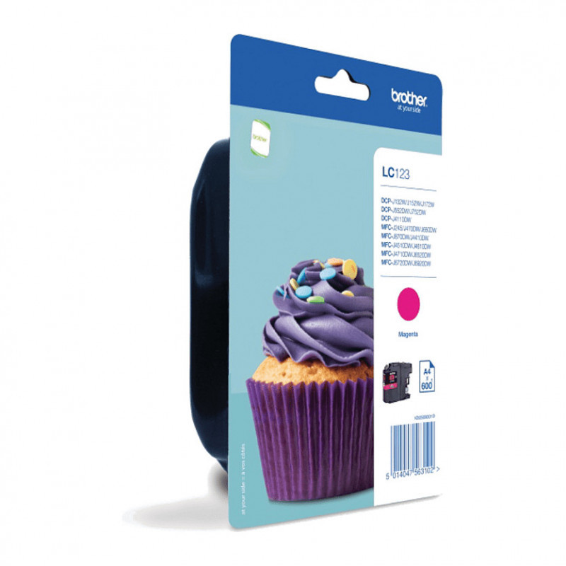 "Brother LC123MBP. Colour ink type: Pigment-based ink, Supply type: Single pack, Colour ink page yield: 600 pages, Printing colours: Magenta, Quantity per pack: 1 pc(s)"\n
