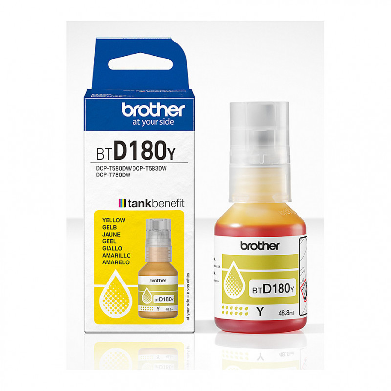 "Brother BTD180Y Yellow Genuine Ink Bottle. Type: Original, Printing colours: Yellow, Brand compatibility: Brother. Quantity per pack: 1 pc(s), Dimensions (WxDxH): 40 x 100 x 45 mm, Package width: 56 mm"\n"Designed to ensure quality documents every time you print, the genuine Brother BTD180Y yellow ink bottle provides a super high yield of 5000 pages, so you can put an end to regular ink replenishment. Just fill up the ink tank and enjoy long-lasting professional quality prints."