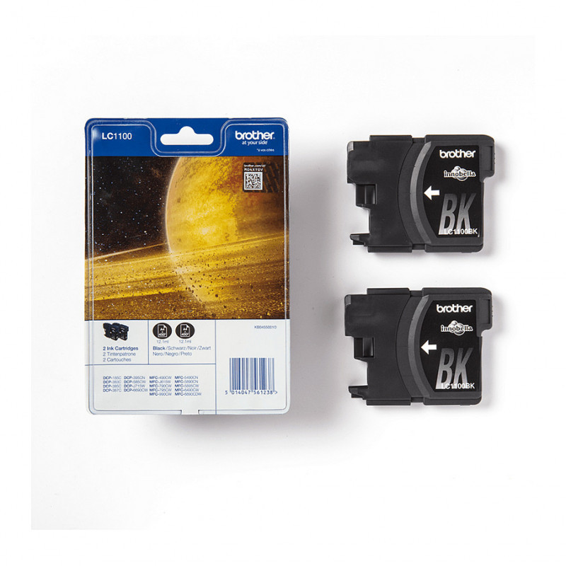 "Brother LC1100BKBP2. Black ink type: Pigment-based ink, Supply type: Twin pack, Printing colours: Black, Quantity per pack: 2 pc(s), Black ink page yield: 450 pages"\n"Purchase the LC1100BKBP2 Black Ink Cartridge Twin Pack to save money on your genuine Brother cartridges. Developed to ensure you always get quality documents, you’ll be protecting your printer from potential long-term damage caused by using non-genuine products."