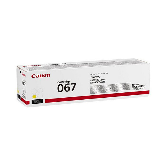 "Canon 067. Colour toner page yield: 1250 pages, Printing colours: Yellow, Quantity per pack: 1 pc(s)"\n"A yellow toner cartridge enabling high quality printing and longevity with compatible i-SENSYS printers