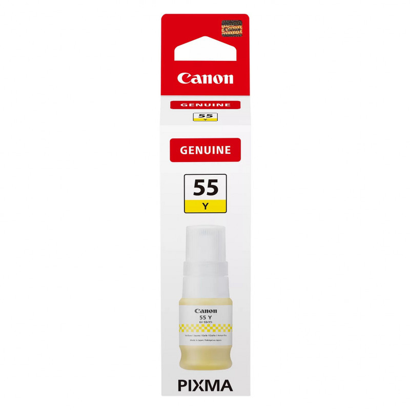 "Canon 6291C001. Supply type: Single pack, Colour ink page yield: 3000 pages, Colour ink volume: 40 ml, Printing colours: Yellow, Quantity per pack: 1 pc(s)"\n"The Canon GI-55Y yellow ink bottle delivers sharp yellow ink to enable the output of business documents and photos at home and at work. When used with a full set of pigment colour inks you can save money as they have a yield of up to 3,000 pages¹ (up to 4,500 in economy mode²), which is great for reducing your costs over time. Finally, the ink benefits from new image processing, meaning that your printed documents are sharper and more durable."