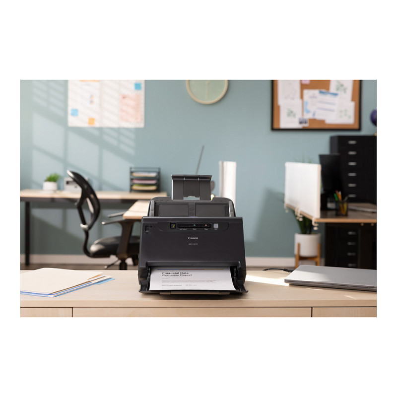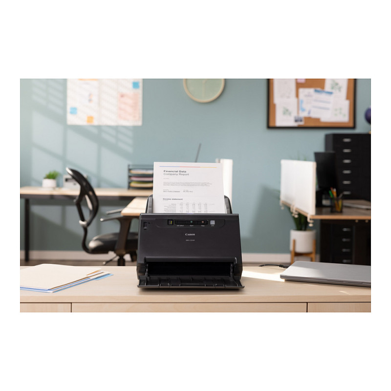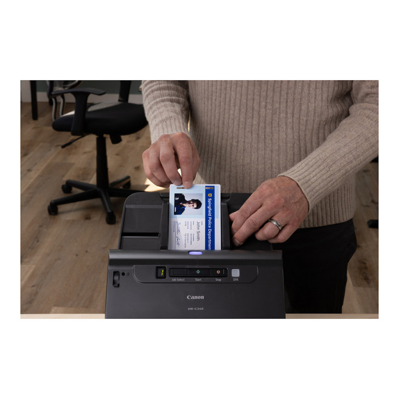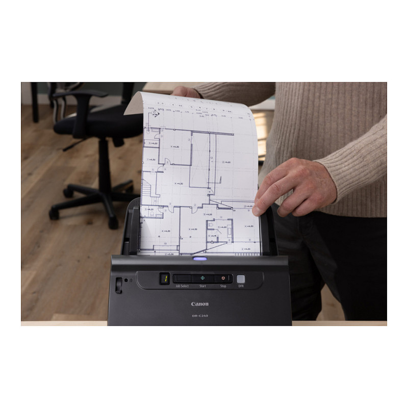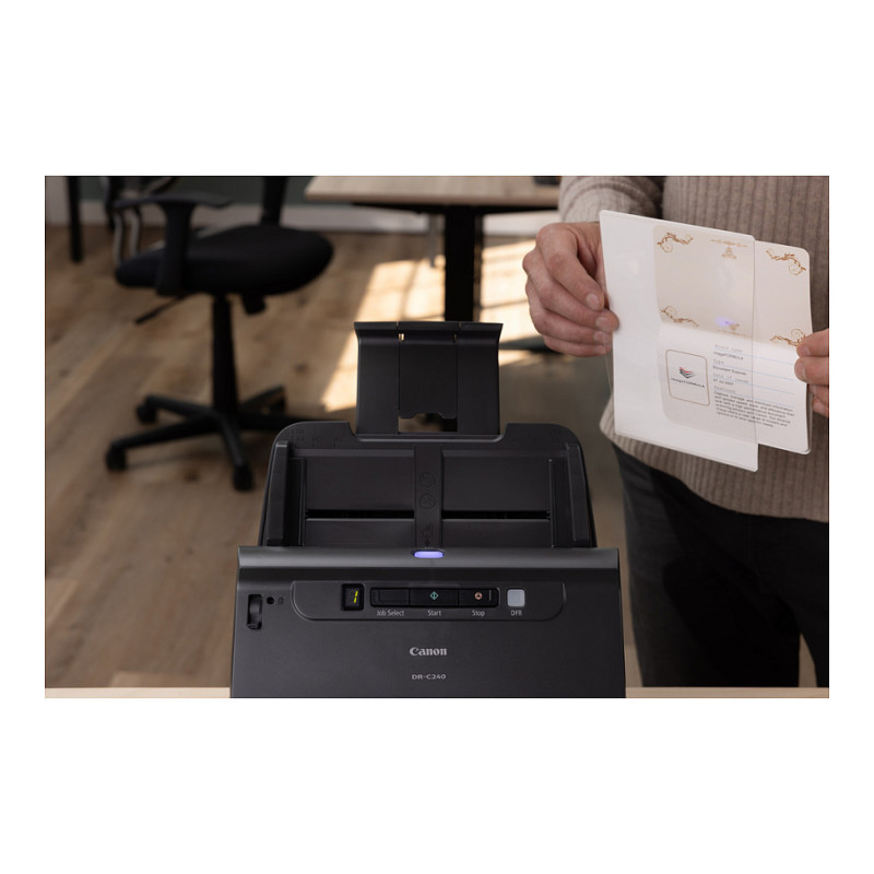 "Canon imageFORMULA DR-C240 Duplex Desktop Document Scanner. Maximum scan size: 216 x 3000 mm, Optical scanning resolution: 600 x 600 DPI, Input colour depth: 24 bit. Scanner type: Sheet-fed scanner, Product colour: Black. Sensor type: CMOS CIS, Daily duty cycle (max): 4000 pages, Light source: RGB LED. Maximum ISO A-series paper size: A4, Scanning media types supported: Business Card, Plastic Card. Standard interfaces: USB 2.0"\n"Canon imageFORMULA DR-C240