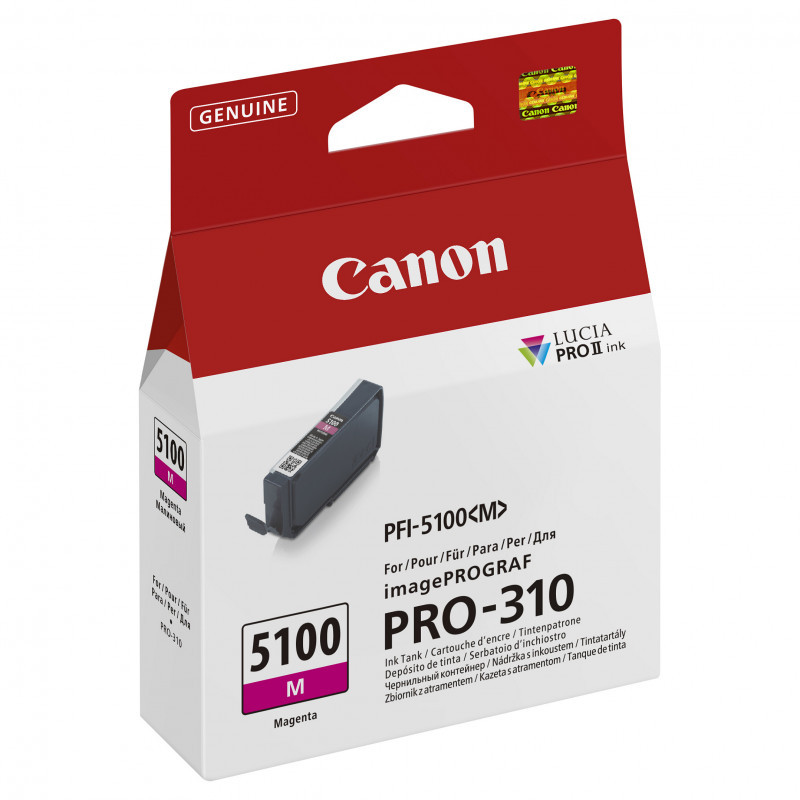 "Canon PFI-5100 M. Supply type: Single pack, Colour ink volume: 14.4 ml, Printing colours: Magenta, Quantity per pack: 1 pc(s)"\n"The LUCIA PRO II ink system provides a broad color gamut and improved gloss uniformity for superb glossiness and anti-bronzing. It helps you achieve an improvement in color-reproduction, image clarity, and enhanced darker areas. It faithfully reproduces colors and dark areas crucial for printing works of art. Ink can be placed more densely, bringing higher color gamut by increasing the number of color droplets on the paper. The Chroma Optimizer ink enhances glossiness, flattens the print surface and expands color range."