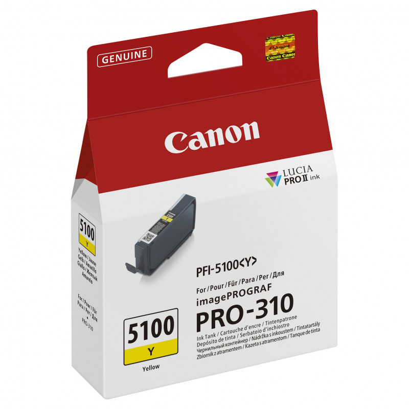 "Canon PFI-5100 Y. Supply type: Single pack, Colour ink volume: 14.4 ml, Printing colours: Yellow, Quantity per pack: 1 pc(s)"\n"The LUCIA PRO II ink system provides a broad color gamut and improved gloss uniformity for superb glossiness and anti-bronzing. It helps you achieve an improvement in color-reproduction, image clarity, and enhanced darker areas. It faithfully reproduces colors and dark areas crucial for printing works of art. Ink can be placed more densely, bringing higher color gamut by increasing the number of color droplets on the paper. The Chroma Optimizer ink enhances glossiness, flattens the print surface and expands color range."