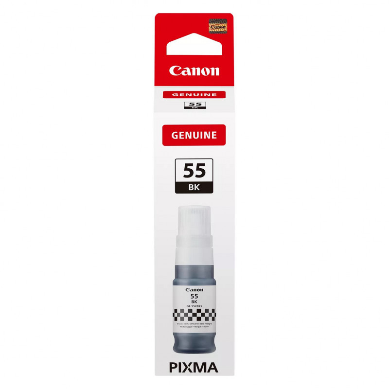 "Canon 6292C001. Black ink volume: 70 ml, Supply type: Single pack, Printing colours: Black, Quantity per pack: 1 pc(s), Black ink page yield: 3000 pages"\n"The Canon GI-55BK black ink bottle delivers sharp pigment black ink to enable the output of business documents and photos at home and at work. This bottle can save you money as it has a yield of up to 3,000 pages¹ (up to 4,500 in economy mode²) which is great for reducing your costs over time. Finally, the ink benefits from new image processing, meaning that your printed documents are sharper and more durable.